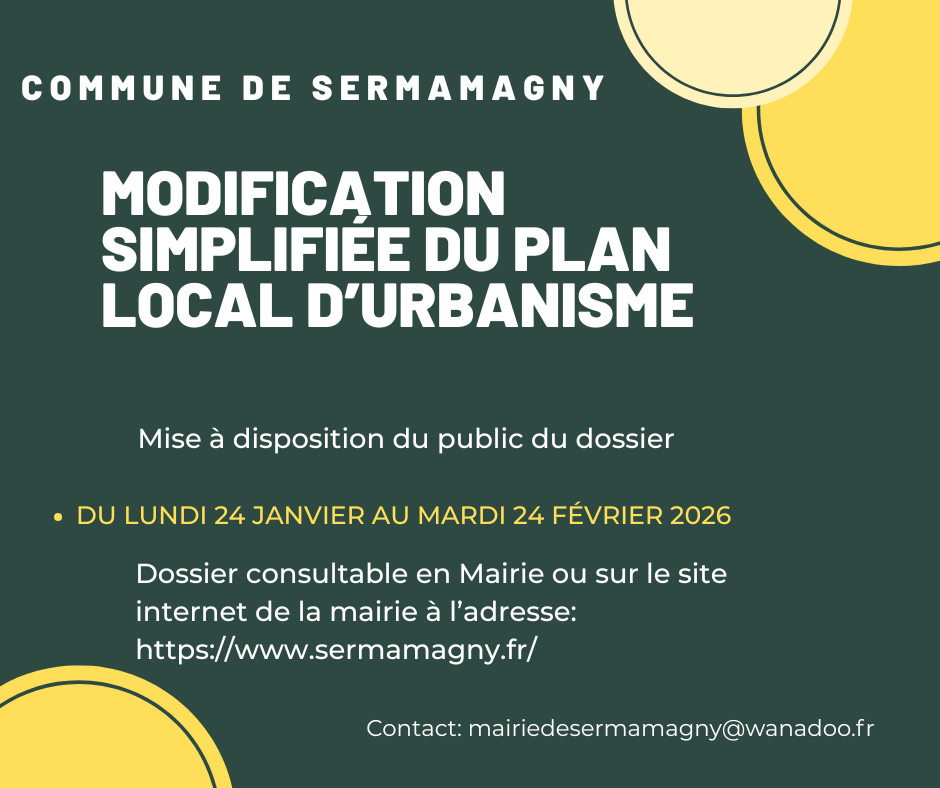 Le dossier est également consultable sur le site de la mairie de Sermamagny : https://www.sermamagny.fr/urbanisme/P.L.U (Plan Local d’Urbanisme).